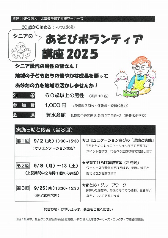60歳から始める(トリプル20歳) あそびボランティア講座 2025 2025年度の遊びボランティア講座は、終了いたしました。 講座の様子は、準備が整いましたらUP致しますので 今しばらくお待ちください(*^-^*)