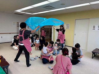 牛乳パックキューブで高さ比べをしたり、 ママたちも一緒に カプラでカマクラを作りました。 みんなで楽しいひと時を過ごしたあと、 折り紙のブドウやリンゴ等の 果物狩りをしました。 |